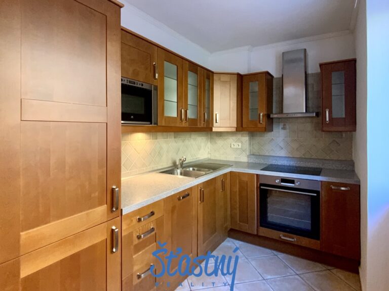 Byt je vybaven kuchyňskou linkou včetně vestavěných spotřebičů – lednice s mrazákem, trouba, sklokeramická deska, myčka, mikrovlnná trouba a digestoř.